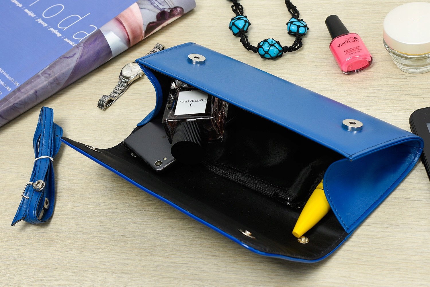 Możesz nosić ją klasycznie w dłoni lub wygodnie na ramieniu – dzięki dopinanemu paskowi dopasujesz ją do stylizacji i okazji.