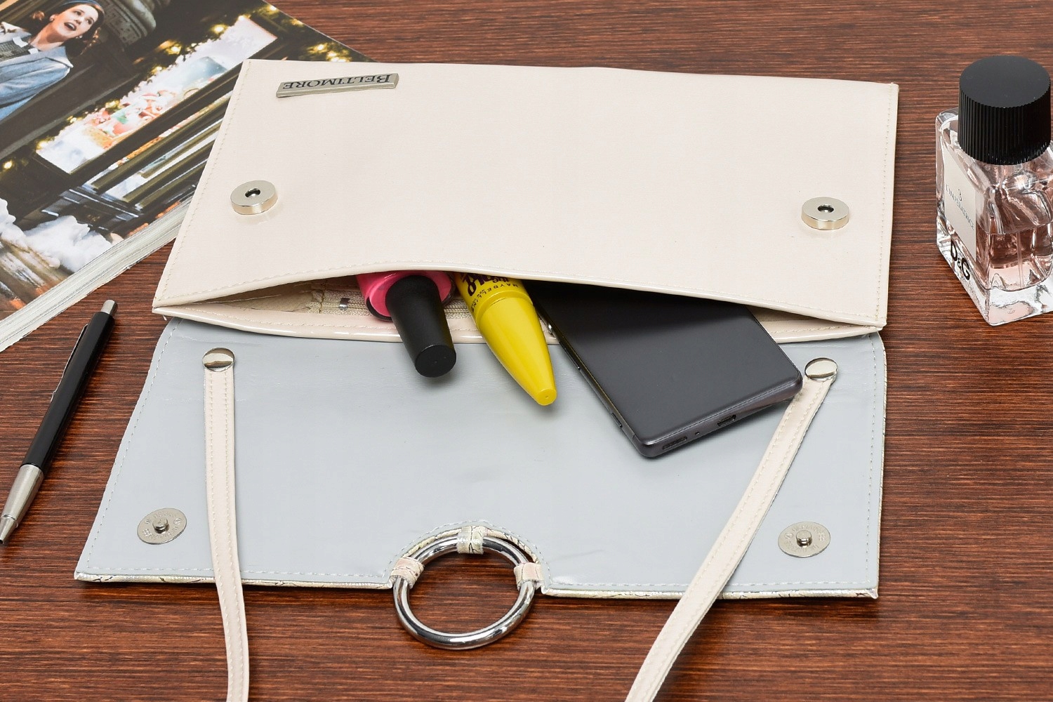 Sztywna kopertówka damska z paskiem – styl i struktura, które działają