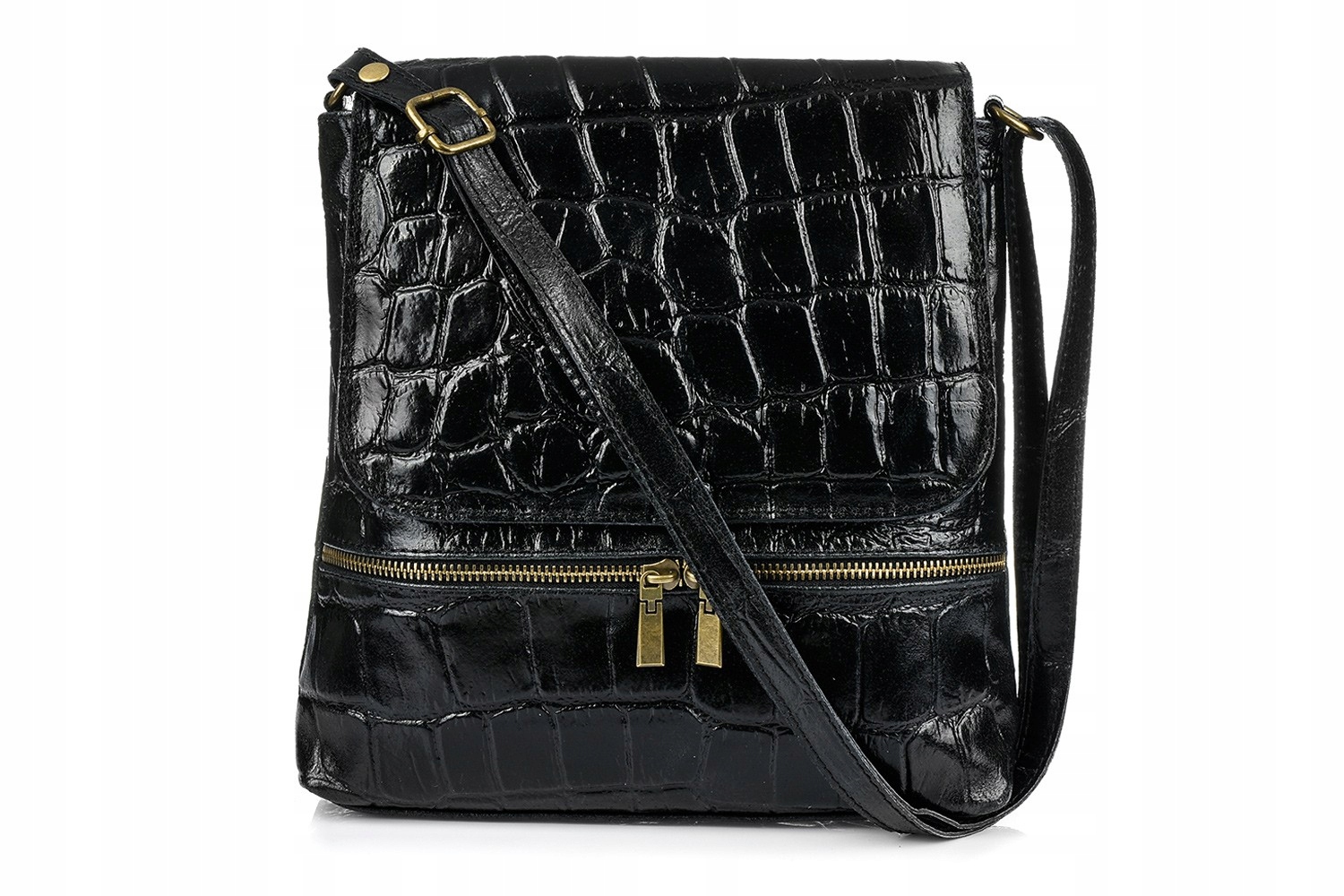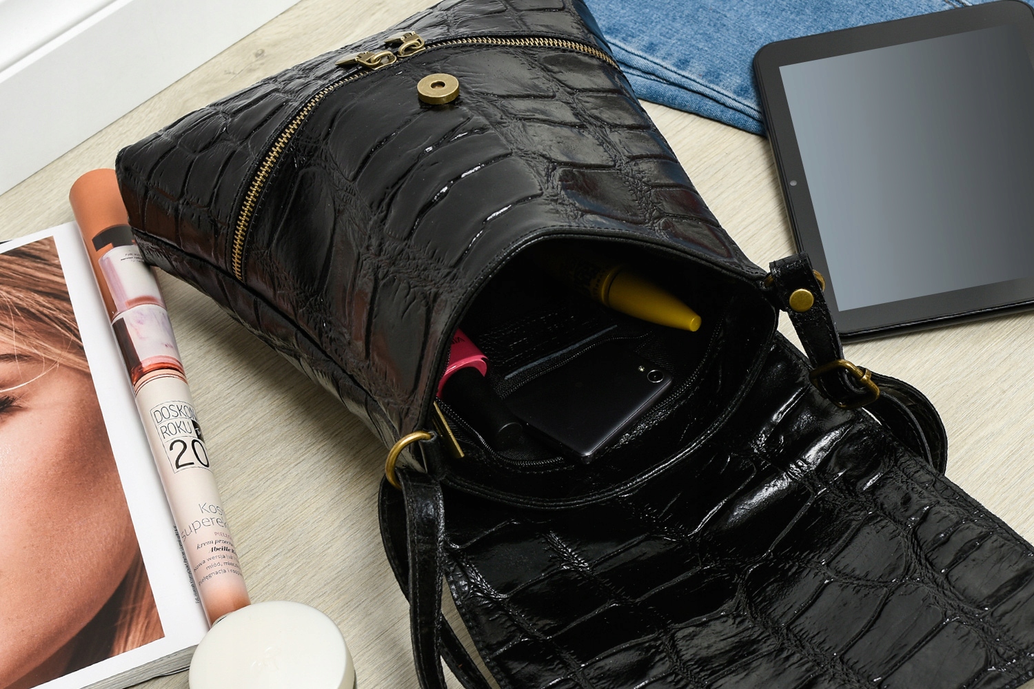 - Naturalna skóra z fakturą croco – stylowy detal