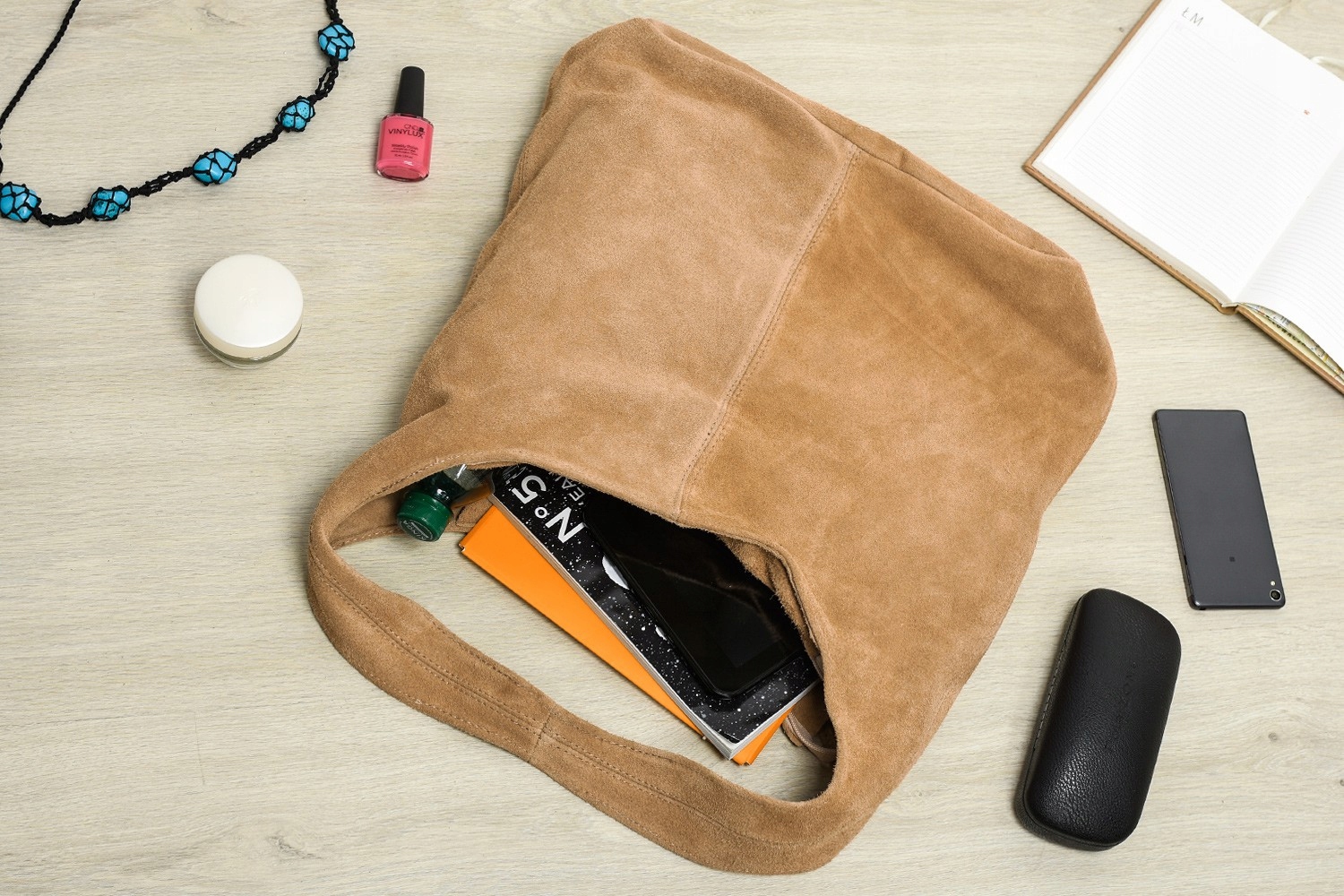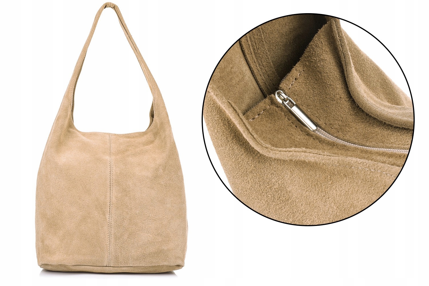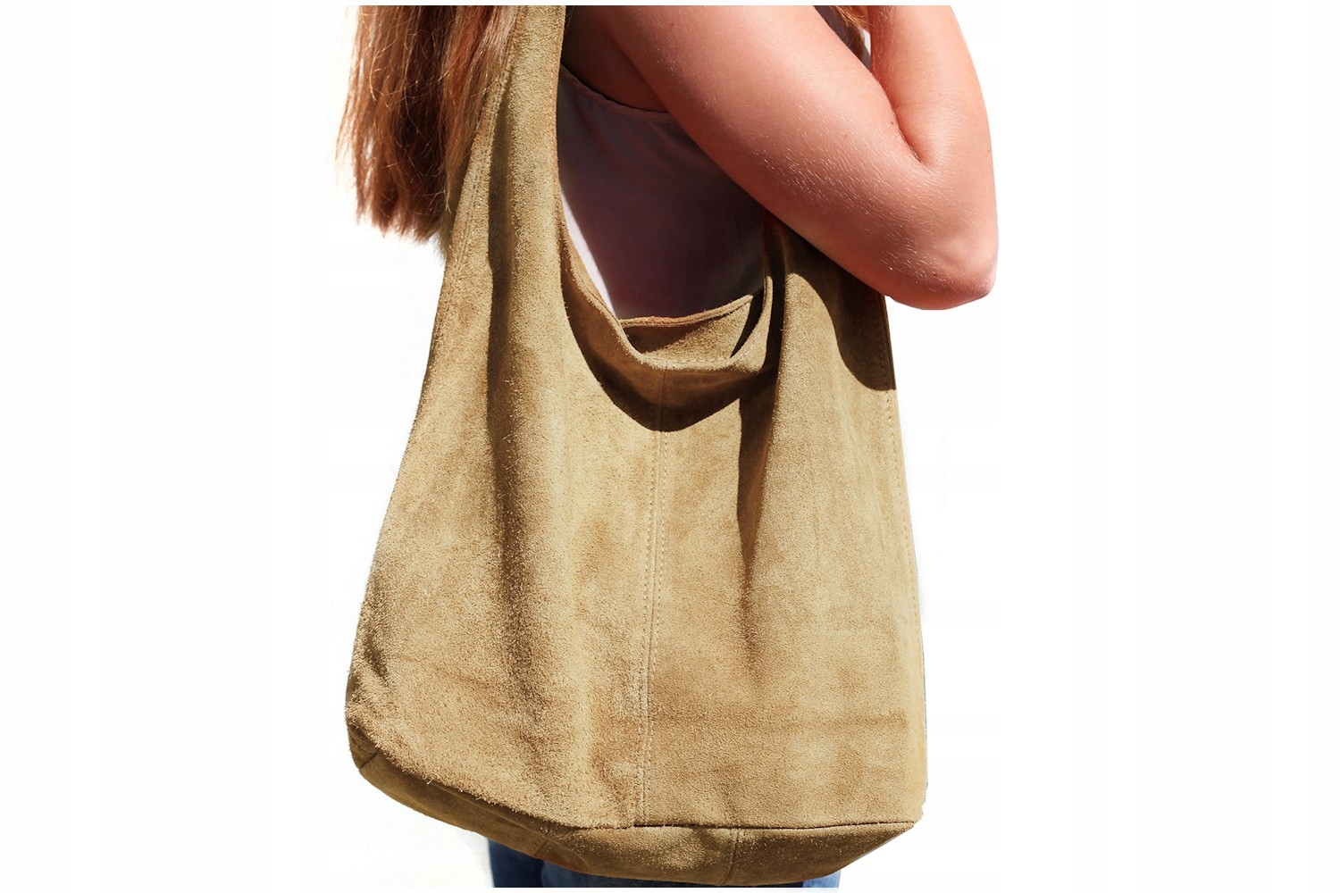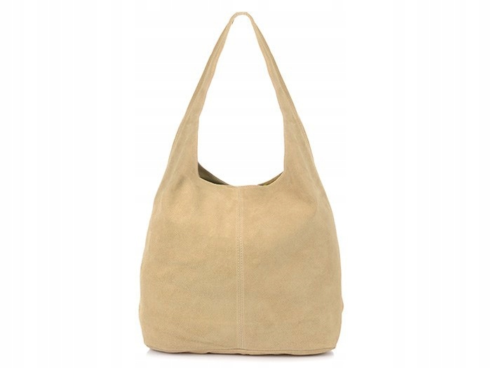 Duża, skórzana, damska torebka typu worek, o minimalistycznym fasonie, wykonana z włoskiego zamszu naturalnego