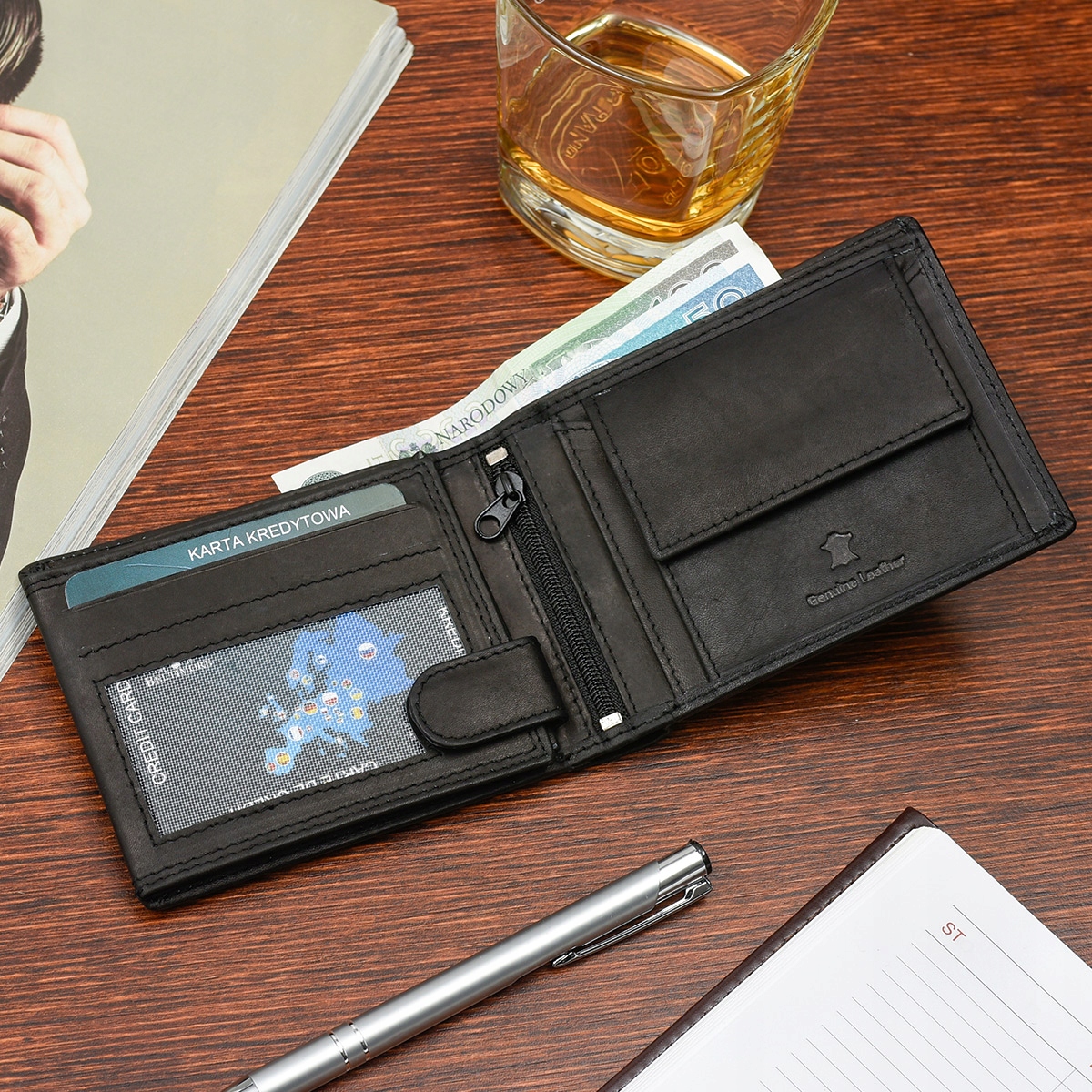 Męski portfel skórzany, poziomy, z ochroną kart zbliżeniowych RFID i nowoczesnym pudełkiem.