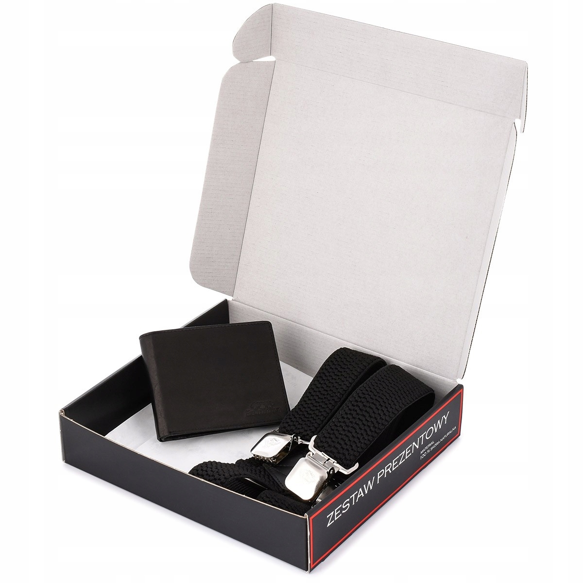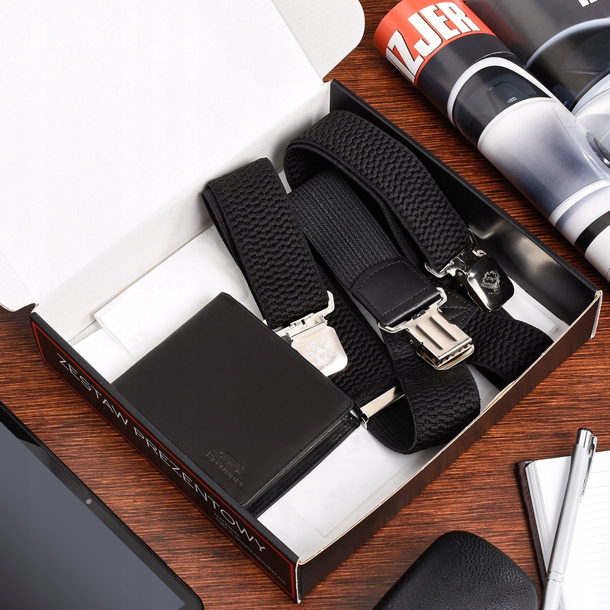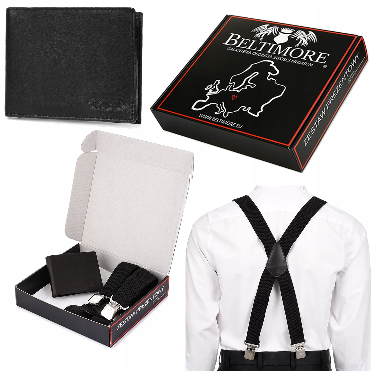 Ekskluzywny, wysokiej jakości, zestaw męski składający się ze skórzanego portfela oraz szerokich szelek w kształcie litery X  w czarnym kolorze, zestaw marki Beltimore®