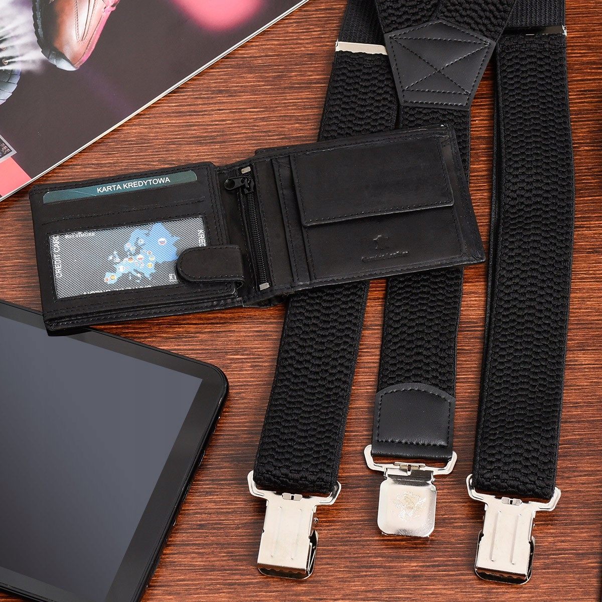 Zestaw przede wszystkim jest bardzo elegancki i praktyczny. Zarówno klasyczny portfel jak i szelki są uniwersalnymi i praktycznymi dodatkami męskiej galanterii. Wszystkie produkty w zestawie są w czarnym kolorze.