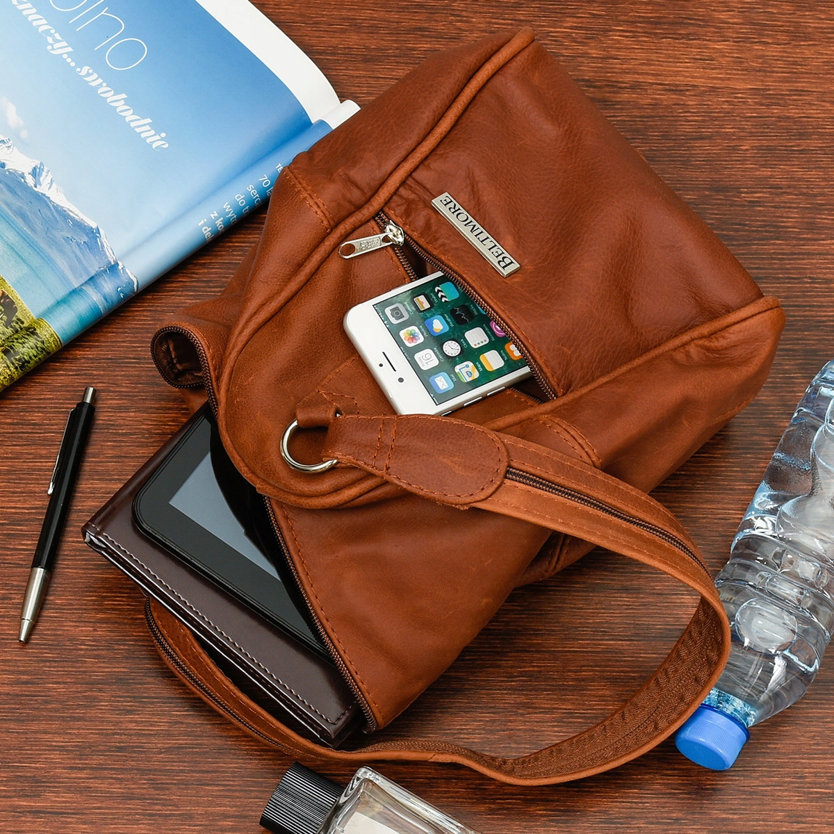 Główna komora zasuwana jest na suwak. W środku pomieszczą się dokumenty formatu A5 i inne, przydatne przedmioty