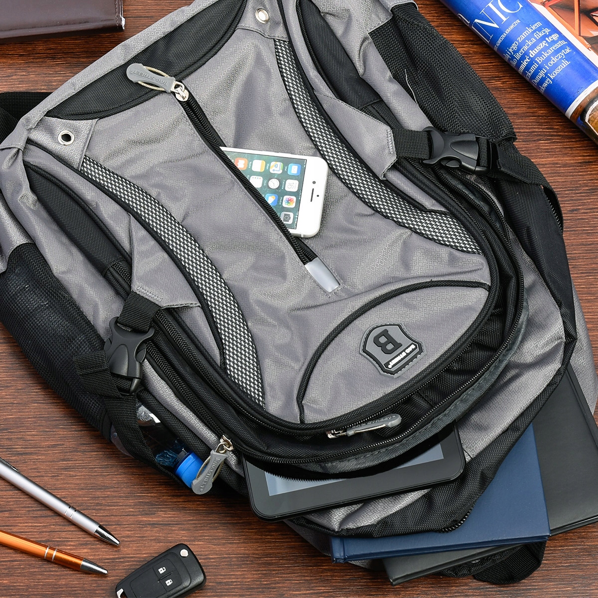 - Wnętrze plecaka to trzy zasuwane komory swobodnie mieszczące format A4
