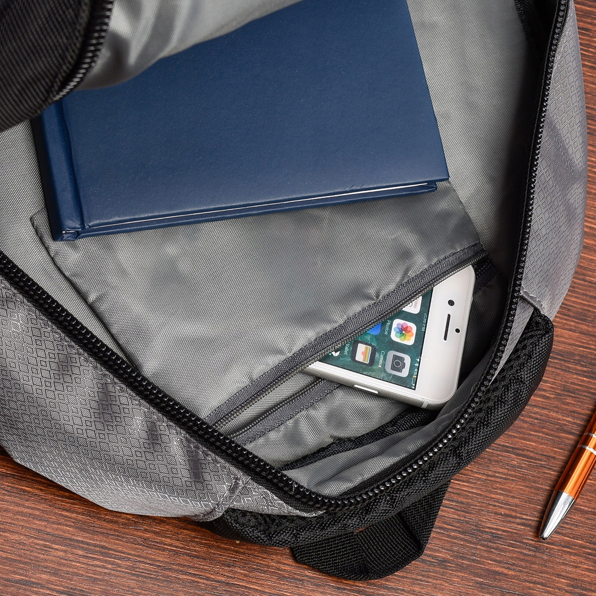 Na froncie znajduje się zasuwana kieszeń wielkości formatu A5 oraz logo marki