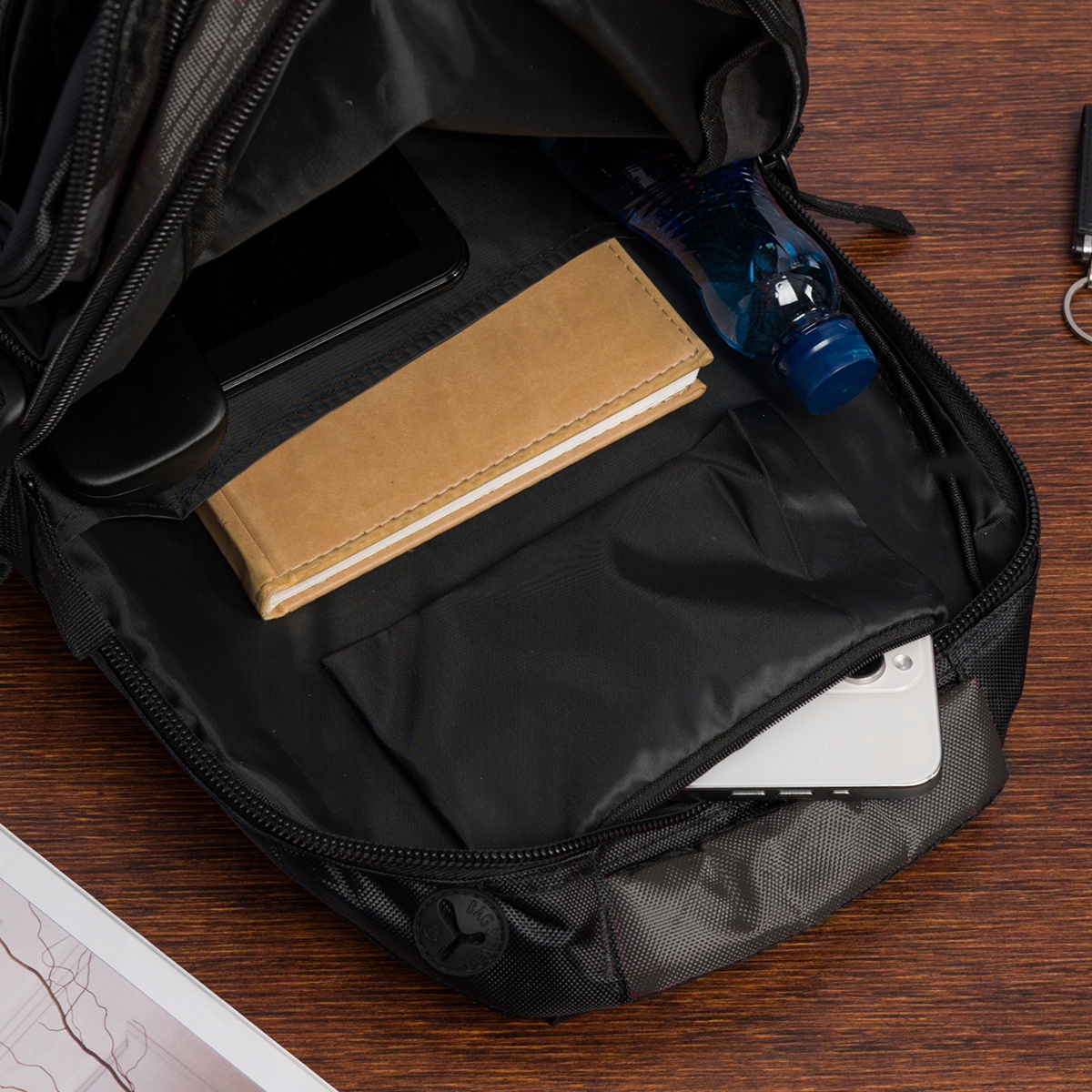 - ? Trzy Pojemne Komory: Zamykane na suwak, swobodnie mieszczą dokumenty formatu A4 i inne niezbędne przedmioty.