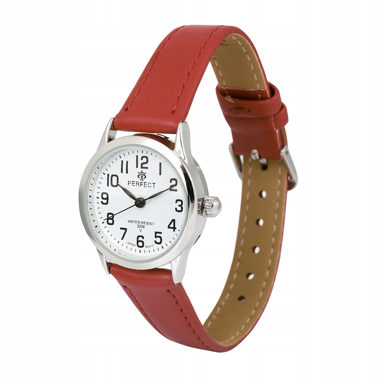 W tej ofercie dostępny jest zegarek z czerwony paskiem i srebrną kopertą.