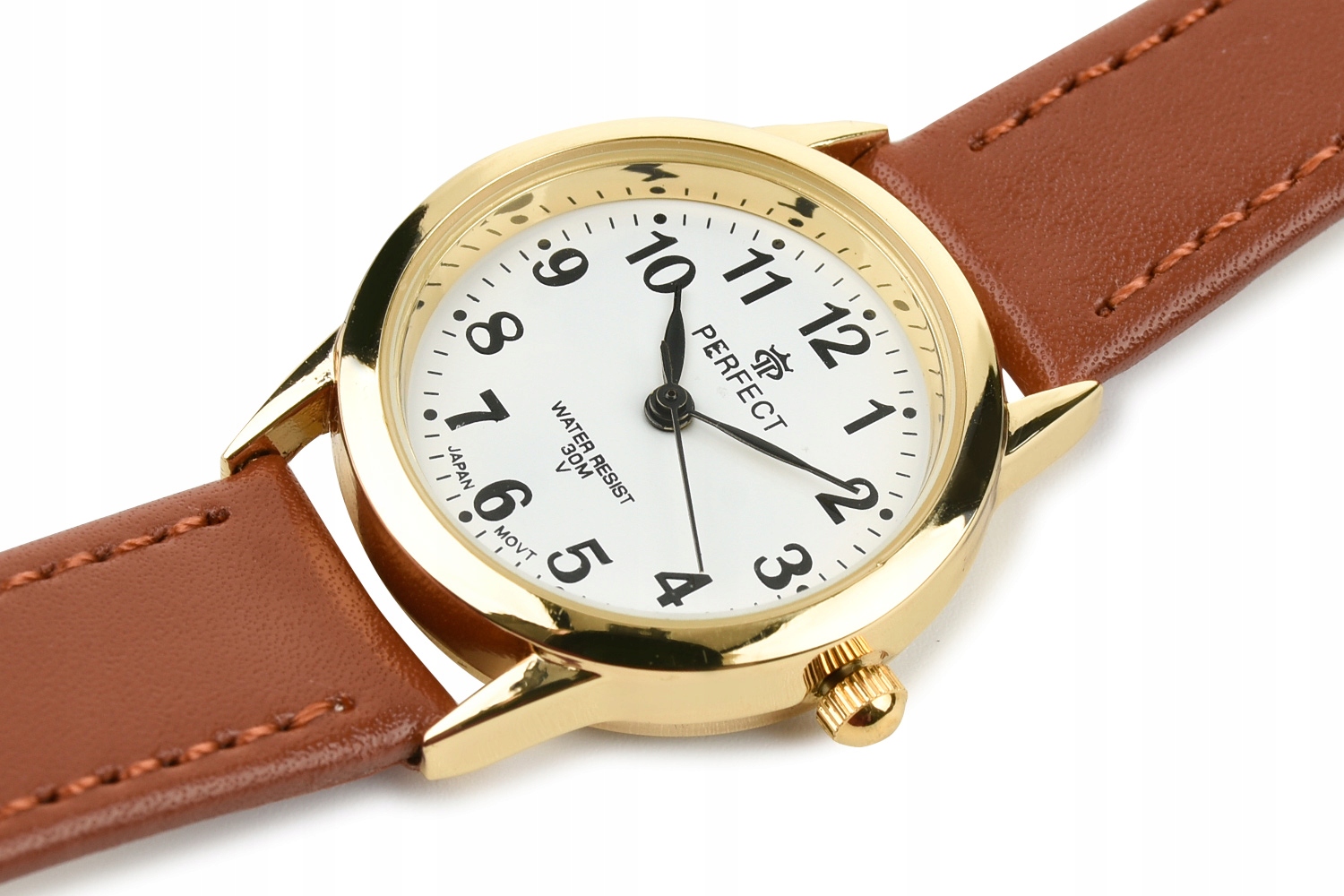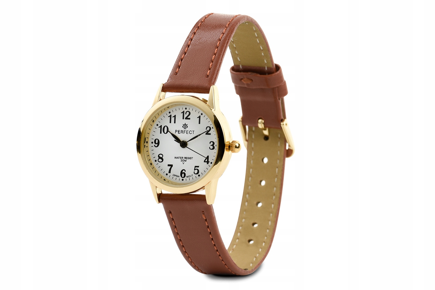 Klasyczny damski zegarek sprawdzonej marki Perfect na pięknym, camelowym pasku, ze złotą kopertą.