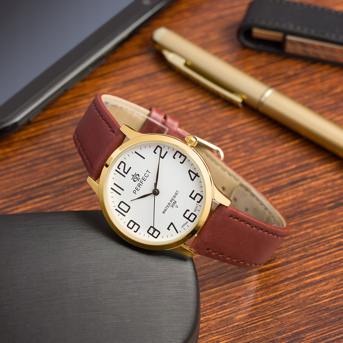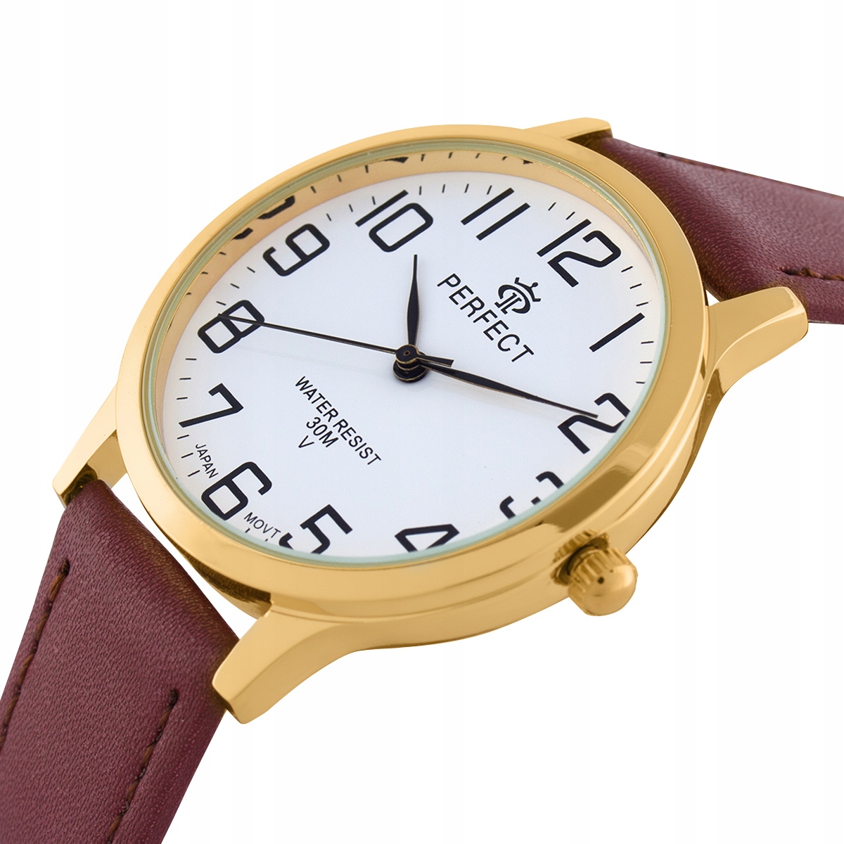Klasyczny męski zegarek o wyraźnych cyfrach i dobrze widocznych wskazówkach- idealny na co dzień! Prezentowany model jest na pasku ze skóry naturalnej w brązowym kolorze oraz ma elegancką, białą tarczę ze złotą kopertą.