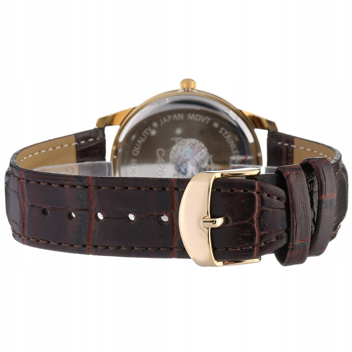 Klasyczny męski zegarek o wyraźnych cyfrach i dobrze widocznych wskazówkach- idealny na co dzień! Prezentowany model jest na pasku ze skóry naturalnej w brązowym kolorze i brązowym obszyciem oraz ma elegancką, białą tarczę.